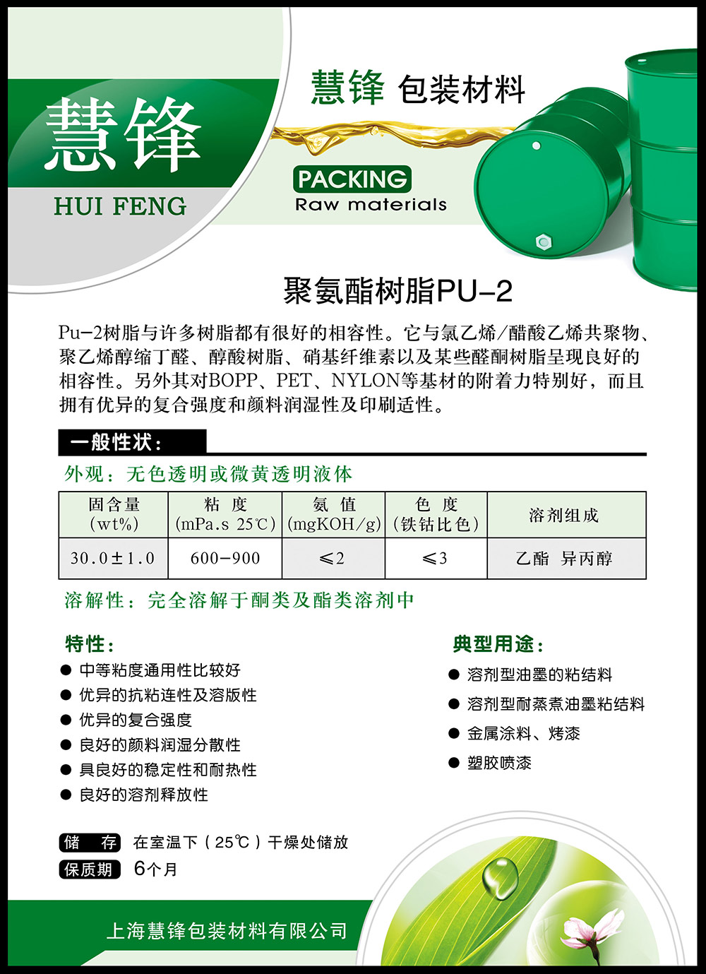 Pu-2树脂与许多树脂都有很好的相容性。它与氯乙烯/醋酸乙烯共聚物、聚乙烯醇缩丁醛、醇酸树脂、硝基纤维素以及某些醛酮树脂呈现良好的相容性。另外其对BOPP、PET、NYLON等基材的附着力特别好,而且拥有优异的复合强度和颜料润湿性及印刷适性。